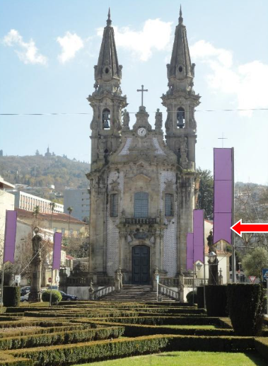 Portugal is a Catholic country and there are historic churches in every city (Figures 41 through 43). One feature to notice is the open bell towers. Another marvelous masonry feature is the use of blue Portuguese tile on many buildings (Figures 42 arrow and 43).