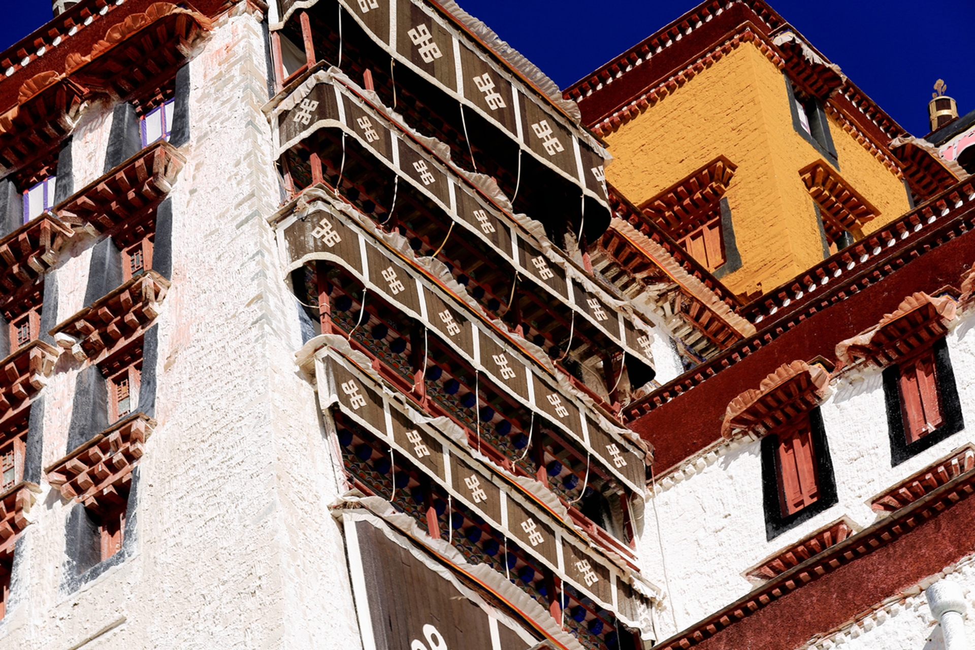 The masonry of the Potala Palace is monumental in scale and ambition. Its walls, made primarily of hand-cut granite and gneiss, are up to 16 feet thick at their base and taper as they rise. This not only gives the building its imposing profile but also provides exceptional strength and stability. The builders employed dry stone masonry methods in many areas, using mud mortar for flexibility and bonding, and strategically embedded horizontal timber beams at various heights to help the structure flex under seismic stress. These methods are as much about engineering as they are about intuition, developed through generations of empirical observation and practical refinement.