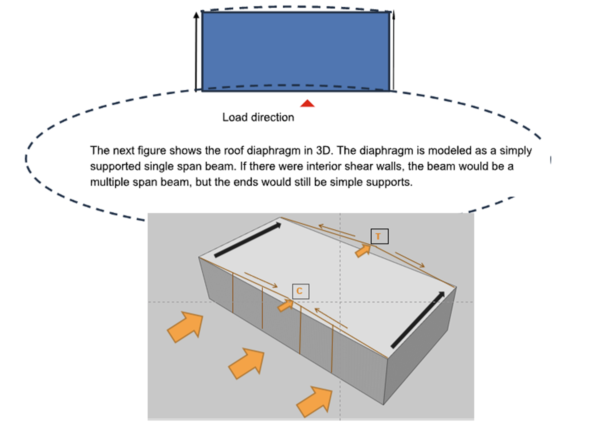 Masonry diaphragms are flat beams shown graphically in the next plan figure. The +diaphragm shows the shear loading going into the shear walls while the flexural stresses going to the masonry diaphragm chords. The forces could also be reversed, and similar conditions would exist if the load were applied to the side walls.