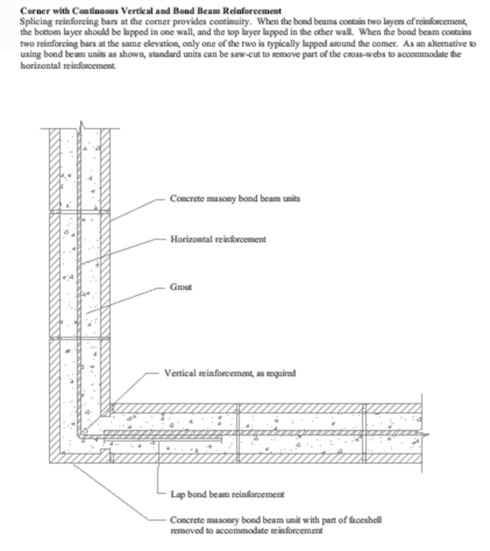 2. If the diaphragm chords are not masonry (such as steel angles or other framing), the bond beam reinforcement at the top of the wall need not be continuous around corners.
