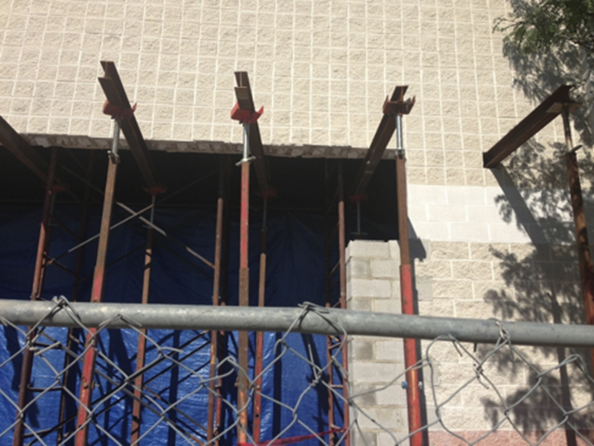 Figure 4 shows a large opening with shoring that was installed incrementally. The opening was cut to receive a new lintel also. Below the end of the opening, the jambs were rebuilt with toothed in half units.