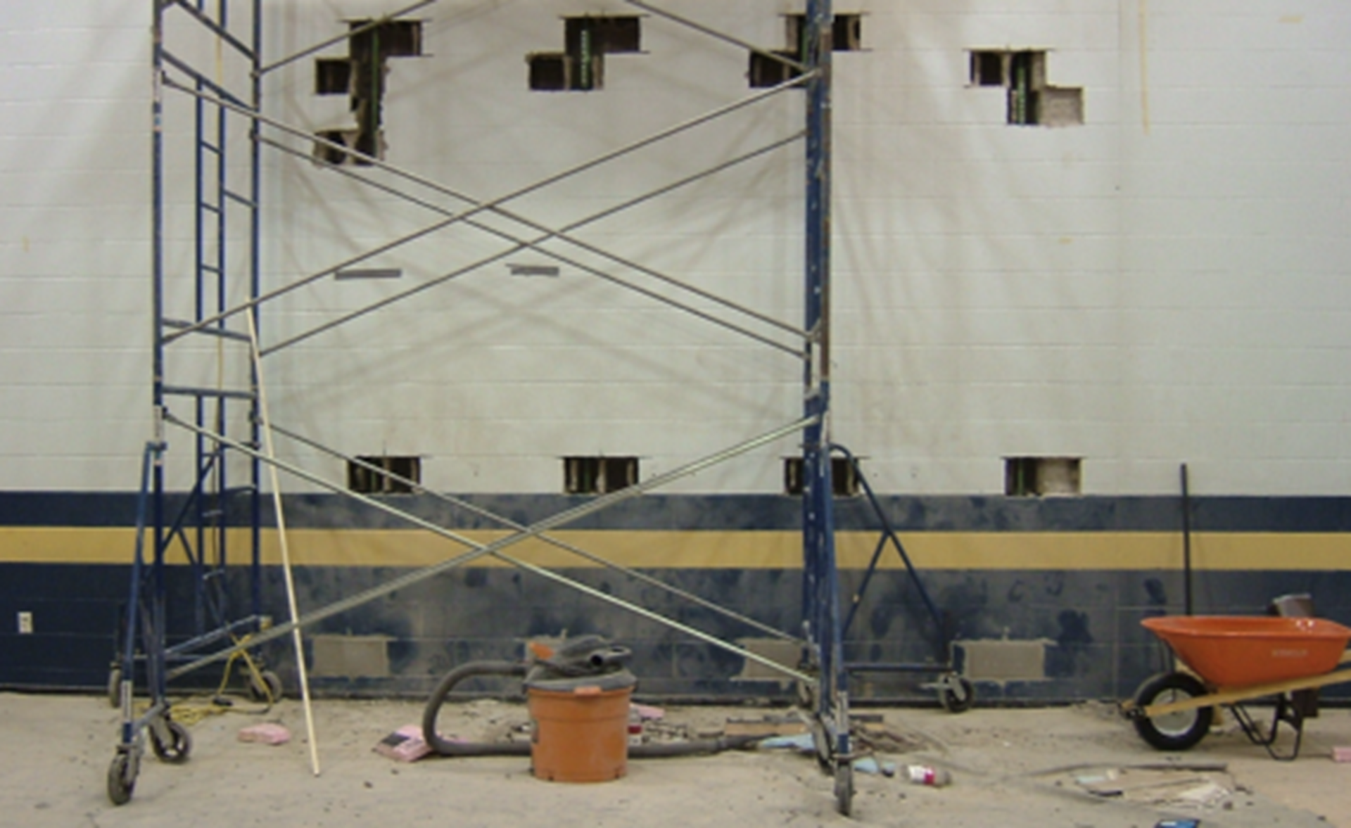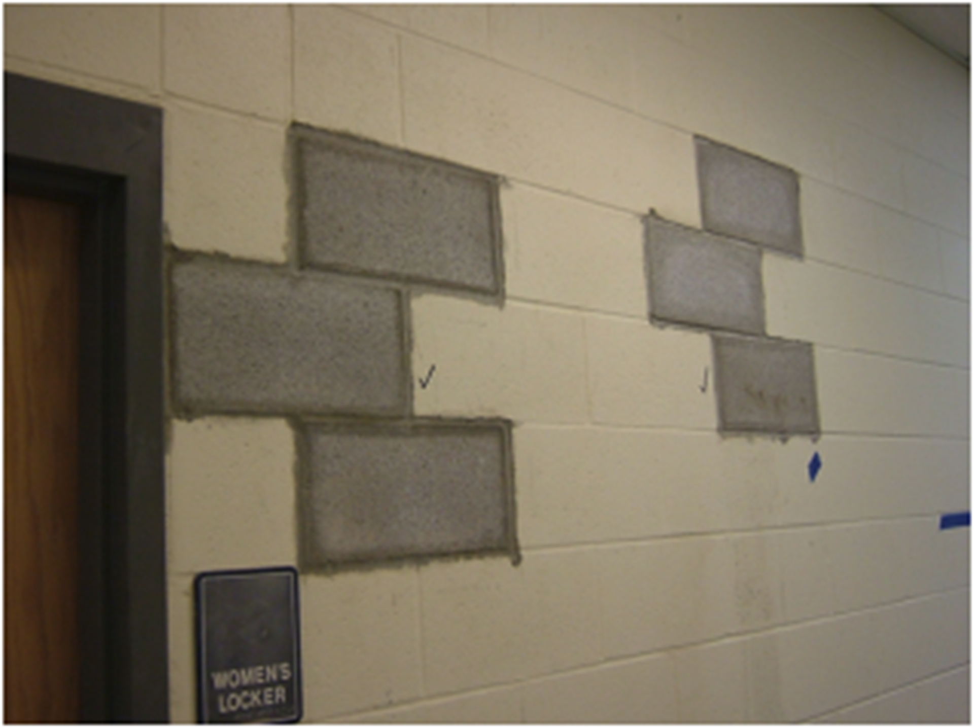 Figure 6 shows a wall where supplemental reinforcement needs to be added. For an exposed interior wall, the complete face shells get removed to form access ports. In this photo, the bottom ports have been infilled. The ports allow for cleaning the cells of excess mortar droppings, lap splice locations, and grouting.