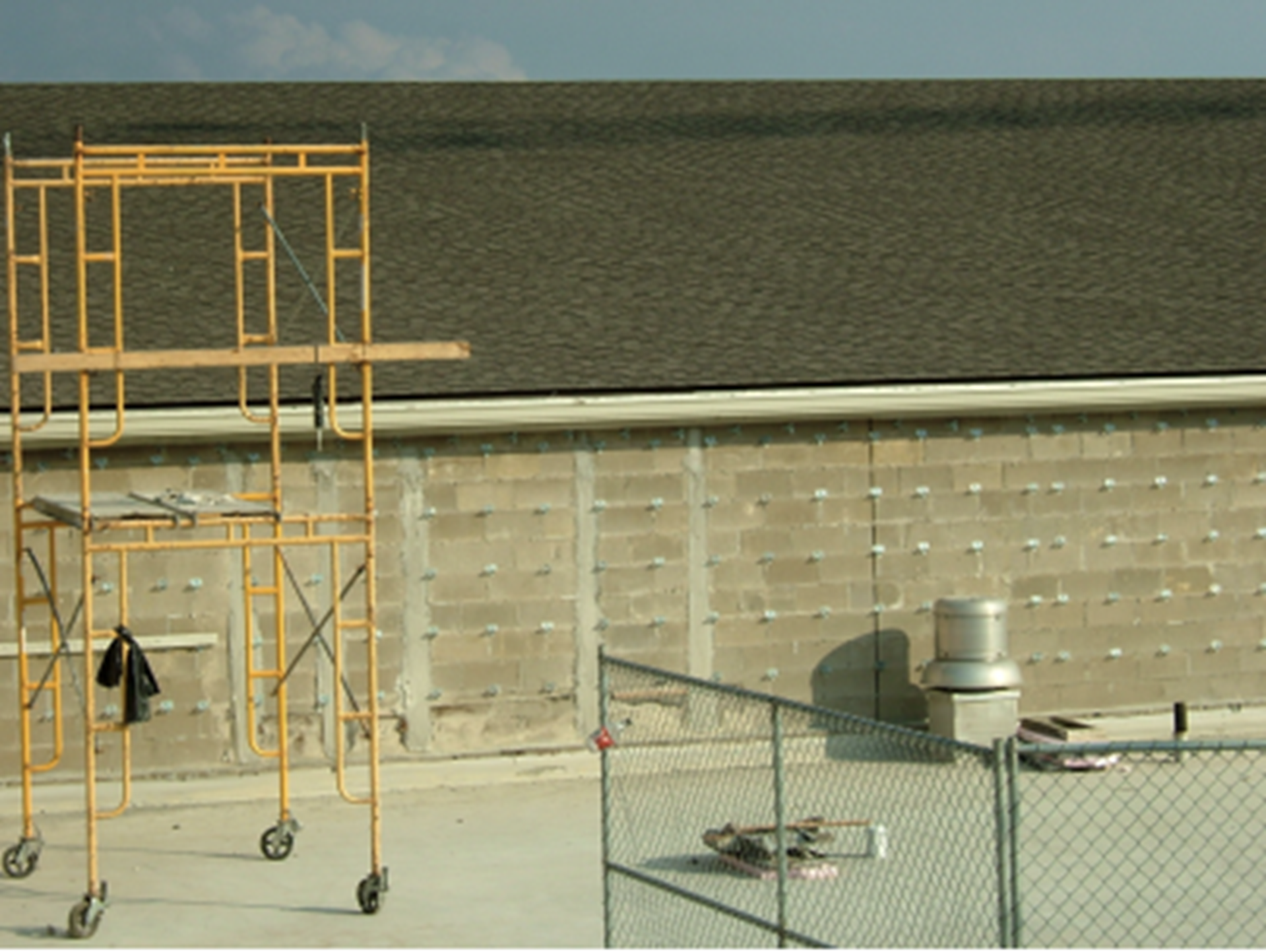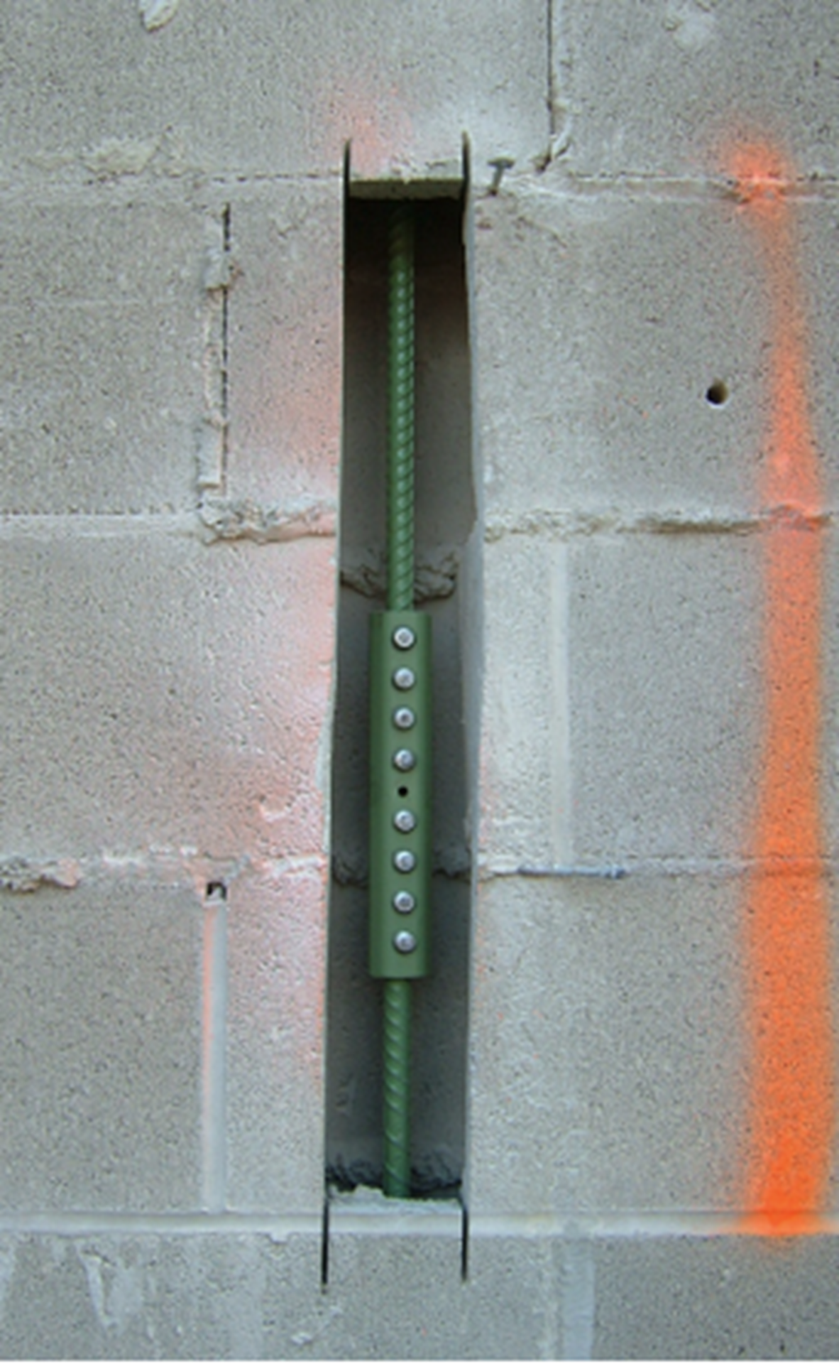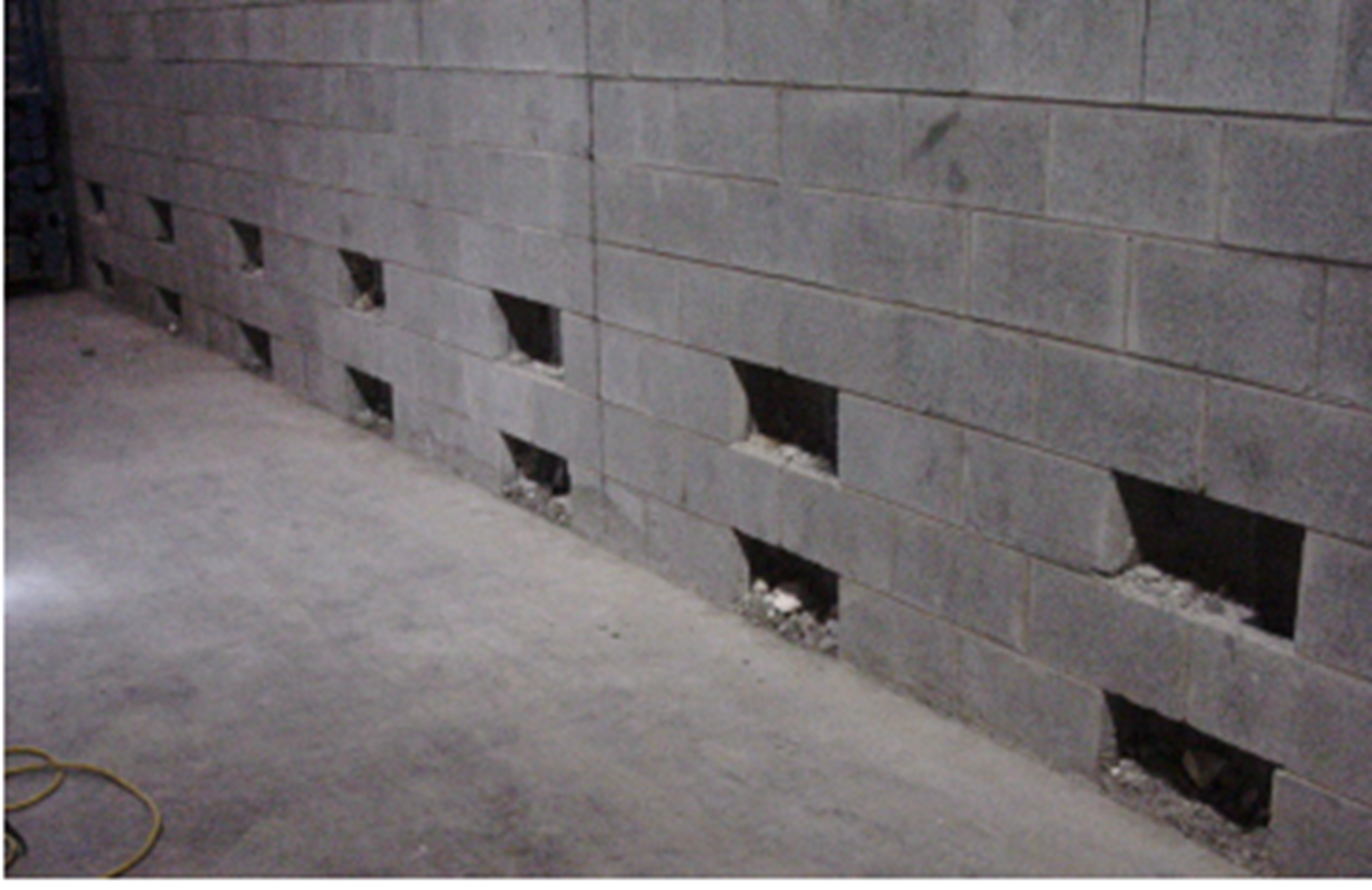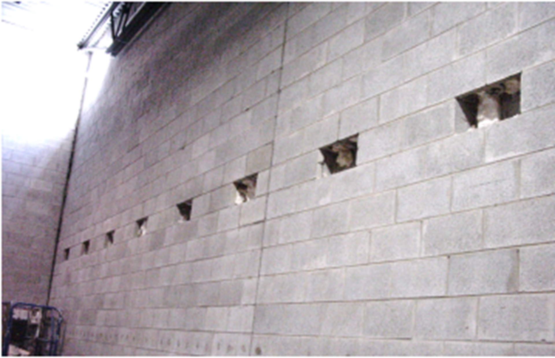 Figures 13 and 14 show the interior ports. The existing cells of the CMU had foam insulation. Cleaning the cells was avoided by using post-tensioning. The bars could be pushed through the insulation.