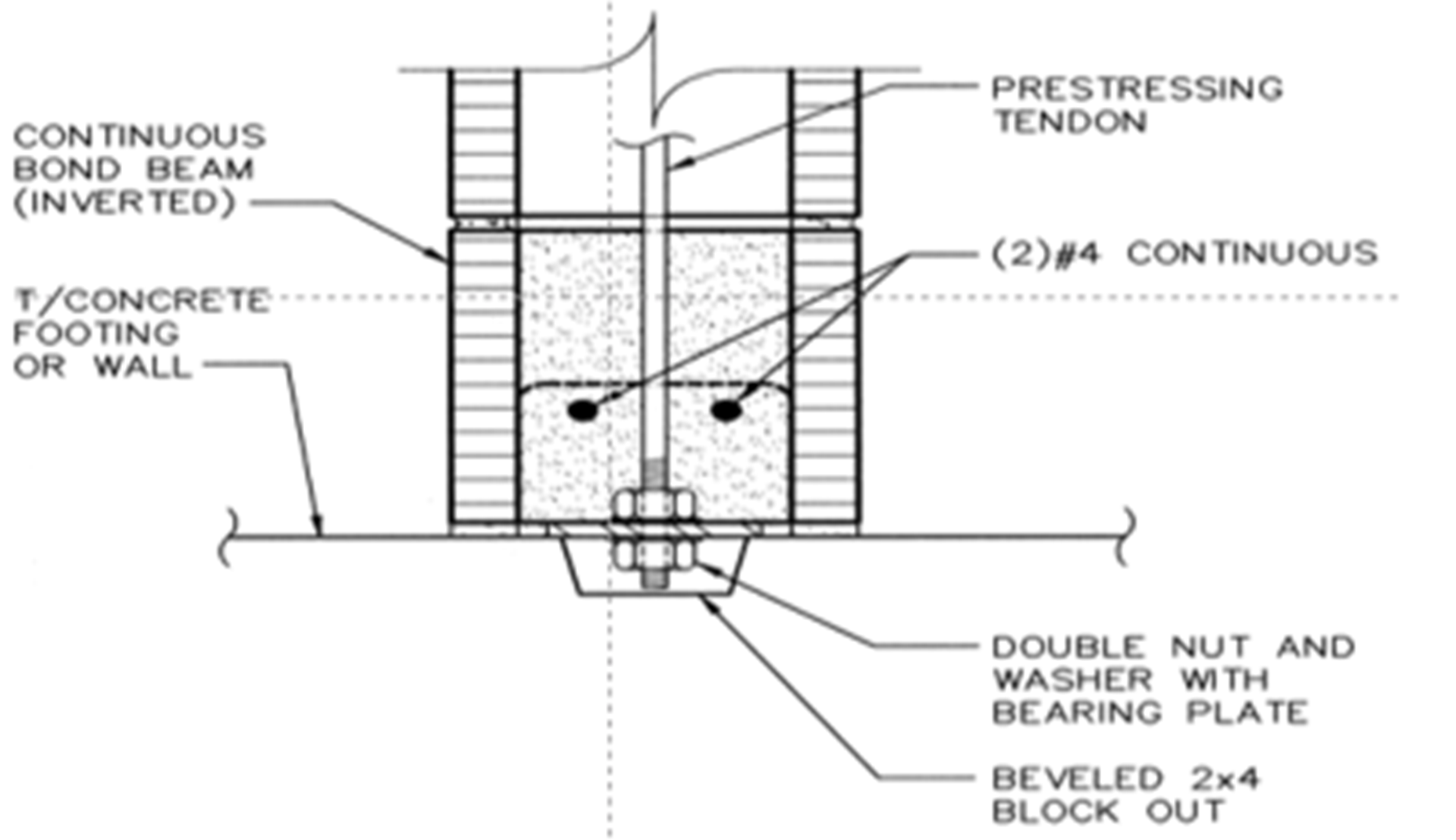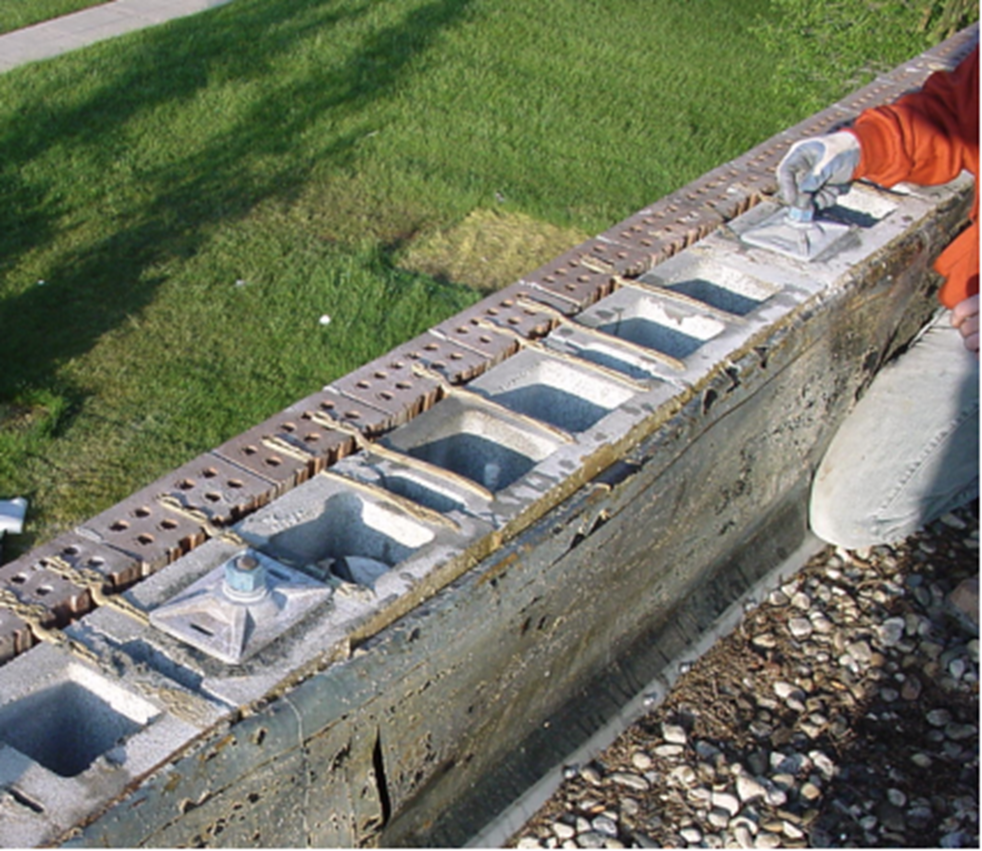 Let’s call the desired additional reinforcement “internal” reinforcement. Two methods for adding this reinforcement that I’ll discuss utilize either mild reinforcement grouted in place or masonry post-tensioning.