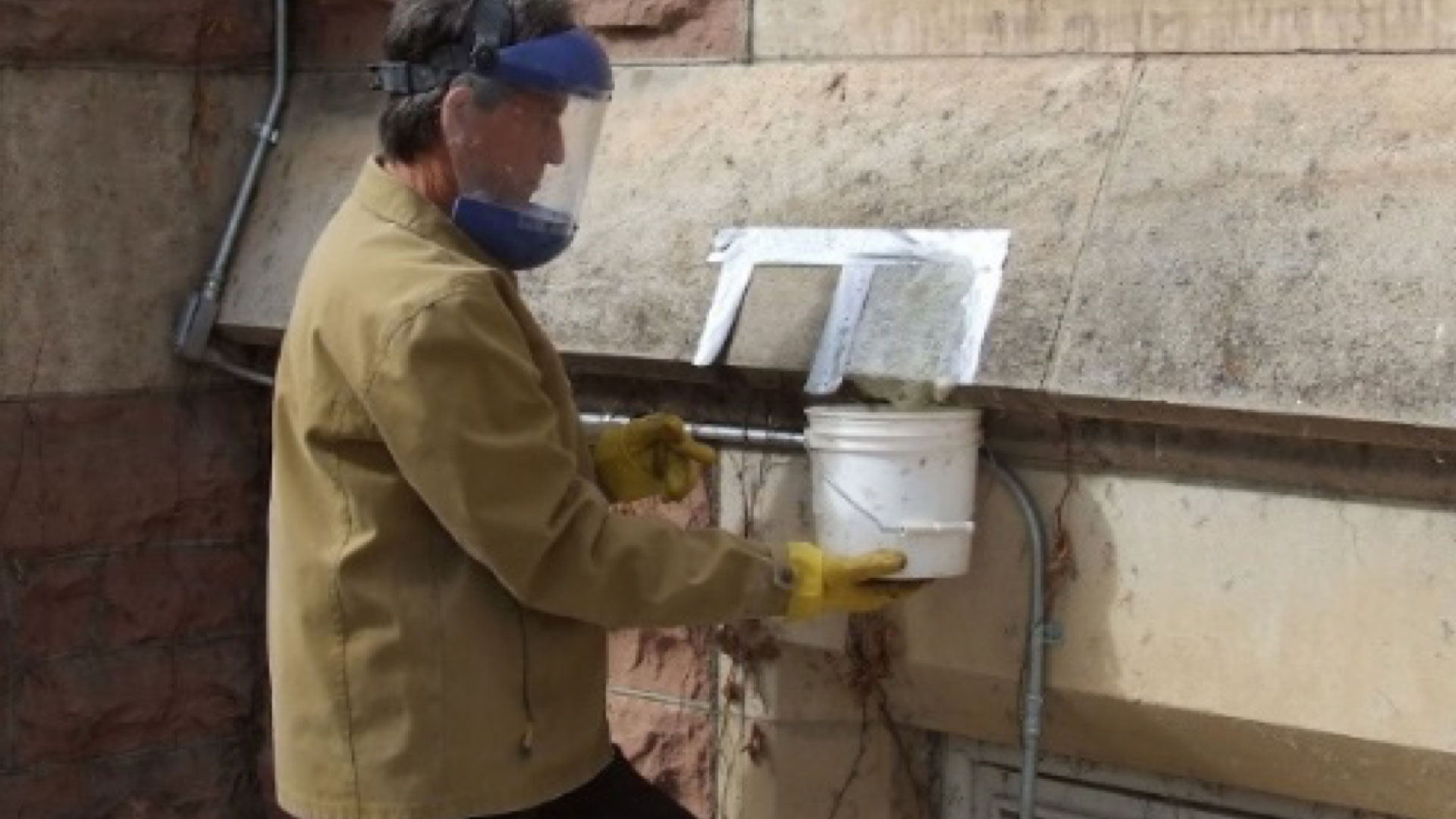Test different cleaning materials and approaches at small areas to figure out the best approach. Solutions are left on the wall to test for the optimal dwell time and to see how the cleaning changes appearance. Your client can see the effect of different cleaning approaches firsthand as an aid in choosing the final cleaning materials and methods. (Figure 1)