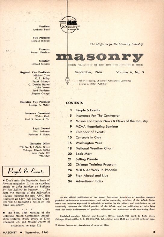 As the official publication of the Mason Contractors Associaton of America, masonry publishes authoritative announcements and articles concerning activities of the MCAA. Statements and opinions expressed in editorials or articles by the editors and contributors do not necessarily represent the official position of the MCAA, and the publication of advertising does not imply endorsement of products advertised nor statements made concerning them.