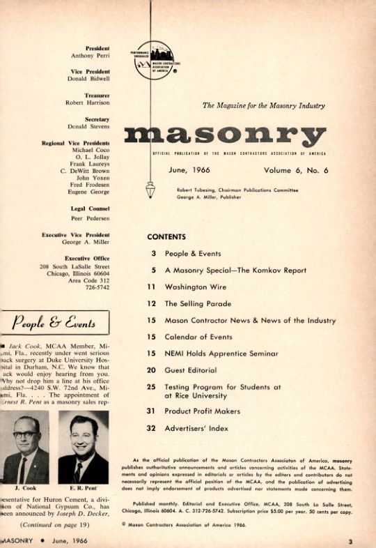 As the official publication of the Mason Contractors Associaton of America, masonry publishes authoritative announcements and articles concerning activities of the MCAA. Statements and opinions expressed in editorials or articles by the editors and contributors do not necessarily represent the official position of the MCAA, and the publication of advertising does not imply endorsement of products advertised nor statements made concerning them.