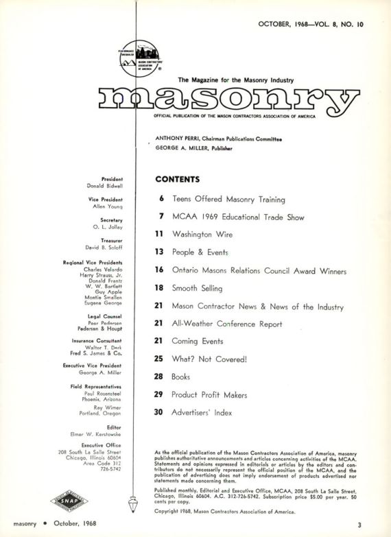 As the official publication of the Mason Contractors Association of America, masonry publishes authoritative announcements and articles concerning activities of the MCAA. Statements and opinions expressed in editorials or articles by the editors and contributors do not necessarily represent the official position of the MCAA, and the publication of advertising does not imply endorsement of products advertised nor statements made concerning them.
