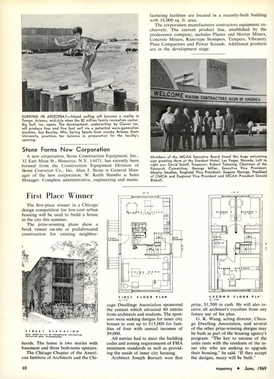All entries had to meet the building codes and zoning requirements of FHA minimum standards as well as providing the needs of inner city housing. Architect Joseph Burnett won first prize, $1,500 in cash. He will also receive all architect's royalties from any future use of his plan.