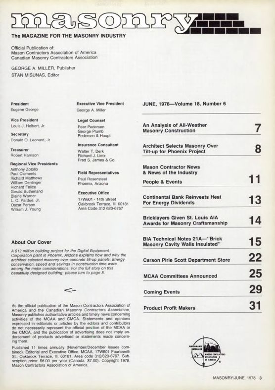 Published 11 times annually (November/December issues combined). Editorial and Executive Office, MCAA, 17W601 Fourteenth St., Oakbrook Terrace, III. 60181. Area code 312/620-6767. Subscription price: $6.00 per year (Canada, $7.00). Copyright 1978, Mason Contractors Association of America.
