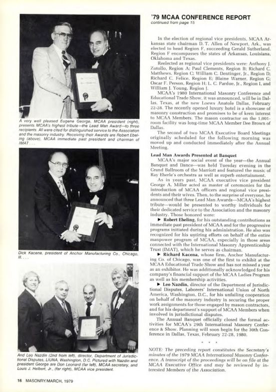 MCAA's major social event of the year the Annual Banquet and Dance was held Tuesday evening in the Grand Ballroom of the Marriott and featured the music of Ray Eberle's orchestra as well as superb entertainment. As in years past. MCAA executive vice president George A. Miller acted as master of ceremonies for the introduction of MCAA officers and regional vice presidents and their wives. Then, to the surprise of everyone, he announced that three Lead Man Awards-MCAA's highest tribute-would be presented to worthy individuals for their dedicated service to the Association and the masonry industry. Those honored were: