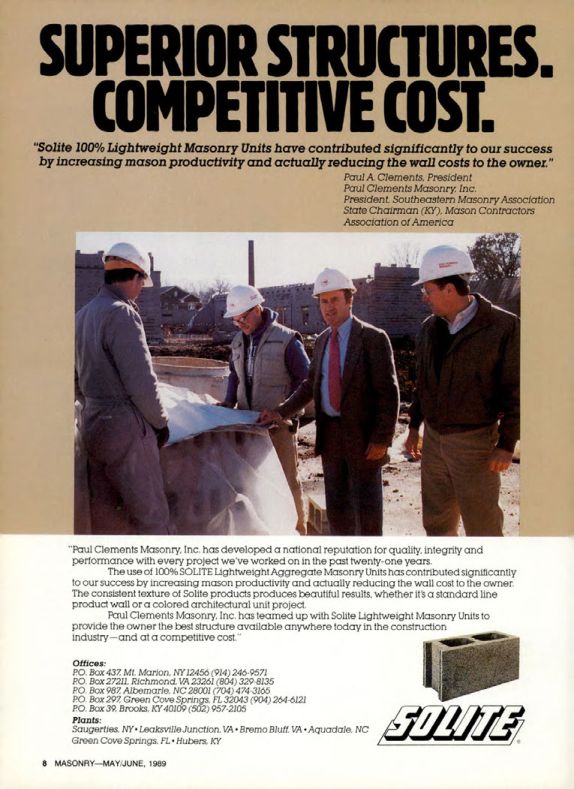 "Paul Clements Masonry, Inc. has developed a national reputation for quality, integrity and performance with every project we've worked on in the past twenty-one years. The use of 100% SOLITE Lightweight Aggregate Masonry Units has contributed significantly to our success by increasing mason productivity and actually reducing the wall cost to the owner. The consistent texture of Solite products produces beautiful results, whether it's a standard line product wall or a colored architectural unit project. Paul Clements Masonry. Inc. has teamed up with Solite Lightweight Masonry Units to provide the owner the best structure available anywhere today in the construction industry and at a competitive cost."