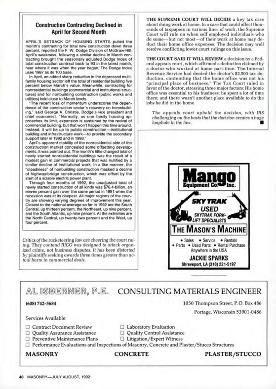 "The recent loss of momentum underscores the dependence of the construction sector's recovery on homebuilding," said George A. Christie, Dodge's vice president and chief economist. "Normally, as one family housing approaches its limit, expansion is sustained by the revival of commercial building, but that won't happen this time around. Instead, it will be up to public construction-institutional building and infrastructure work-to provide the secondary support later in 1992 and in 1993."