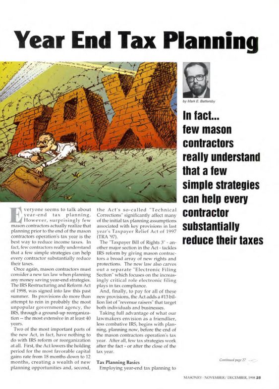 Taking full advantage of what our lawmakers envision as a friendlier, less combative IRS, begins with planning, planning now, before the end of the mason contractors operation's tax year. After all, few tax strategies work after the factor after the close of the tax year.