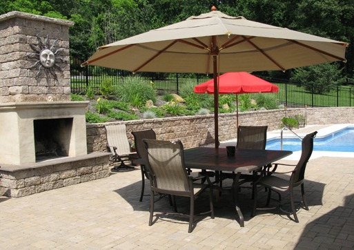 After adding a new addition to his rural home, the homeowner designed and built a large outdoor living area with an in-ground pool; a complex, 360-degree perimeter drainage and underground vault system to access septic tanks; and a custom-built fireplace. He back-sloped the area above and behind the retaining walls, and added soft landscaping for depth and color.