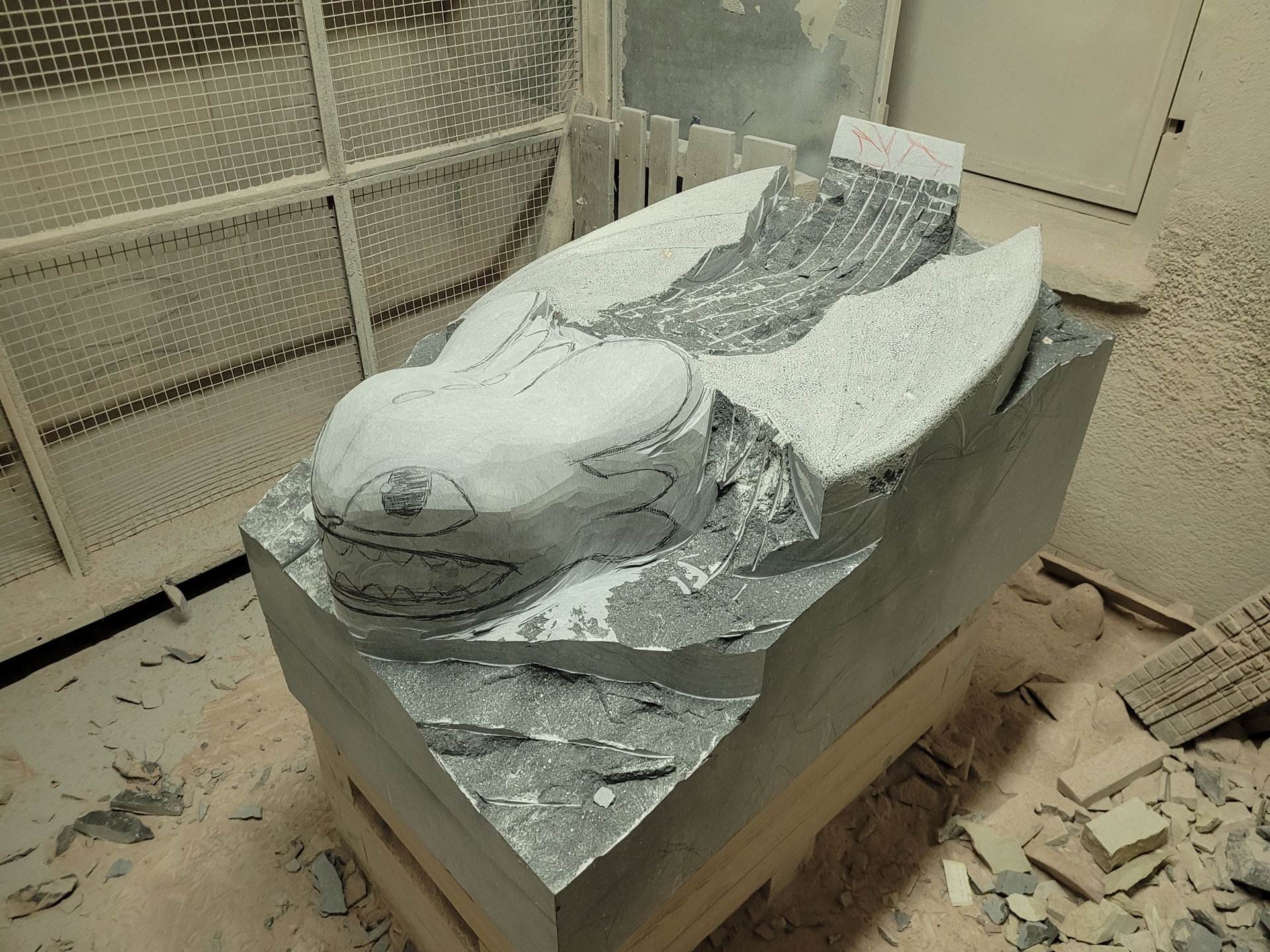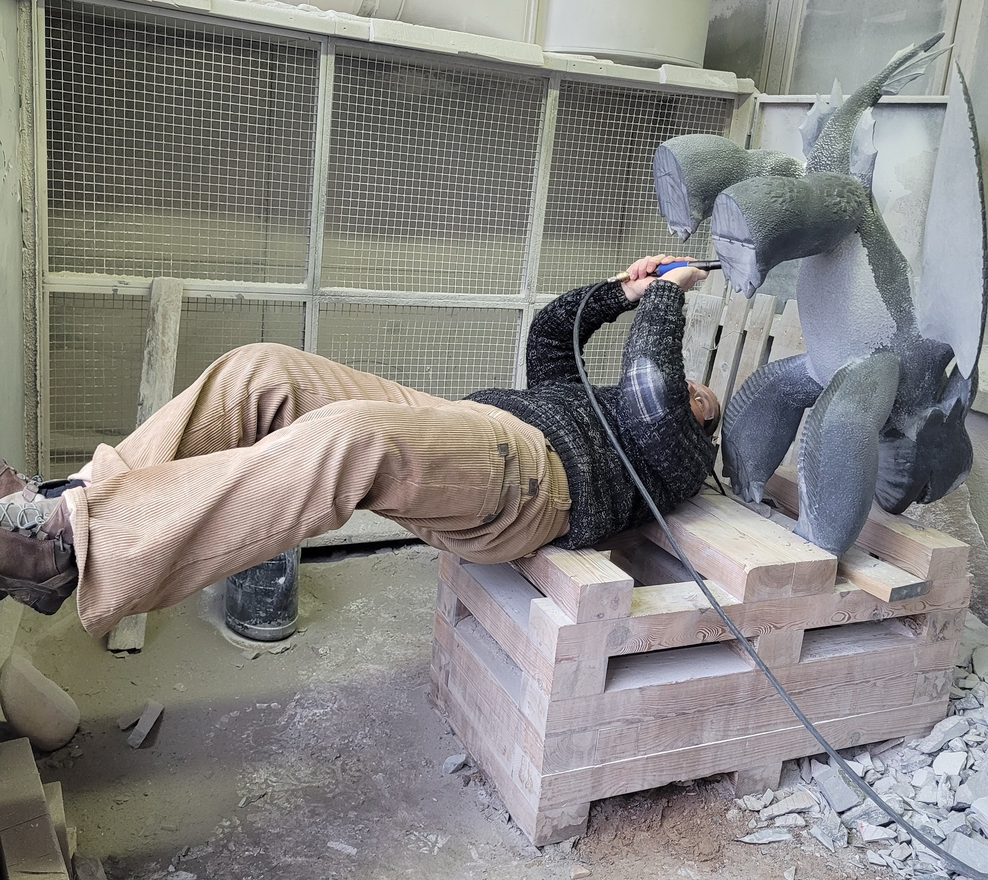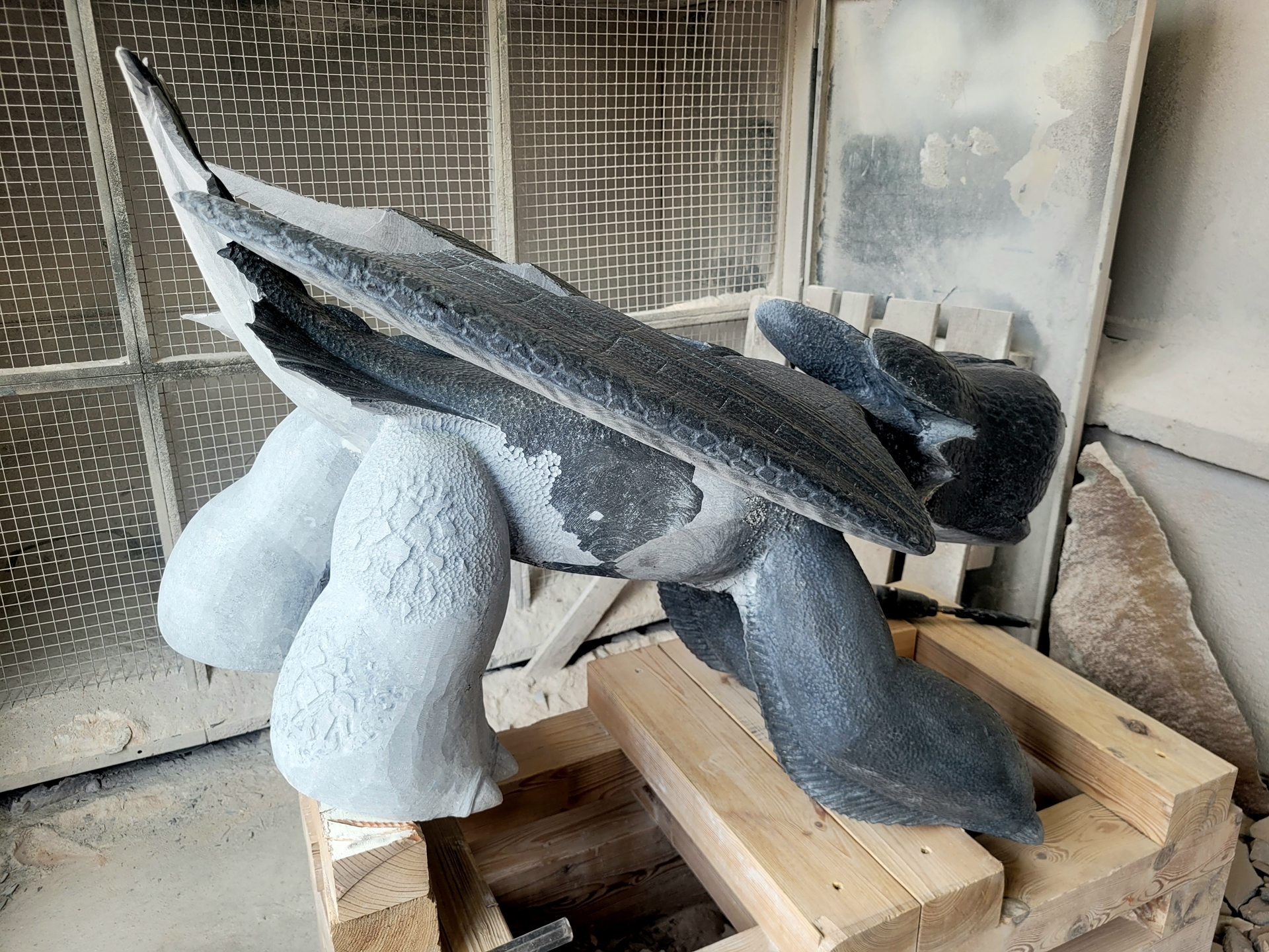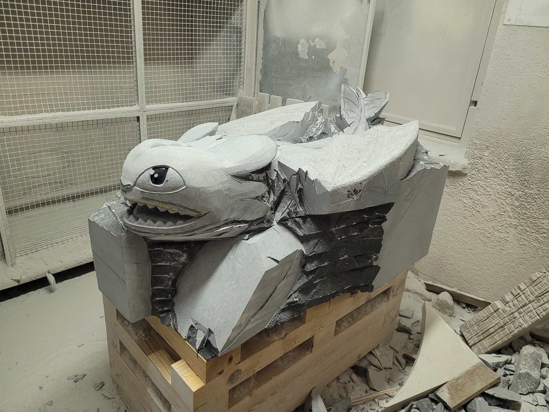Eventually, only the underside remained: the belly, neck, and inner legs. To reach those areas, we had to tip the now much lighter block. With some courage and help from my journeyman, we managed it. The dragon balanced on its forepaws and jaw in a pose that could have passed for a yoga position. It looked odd at first, but it was stable enough to let me finish the remaining surfaces.
