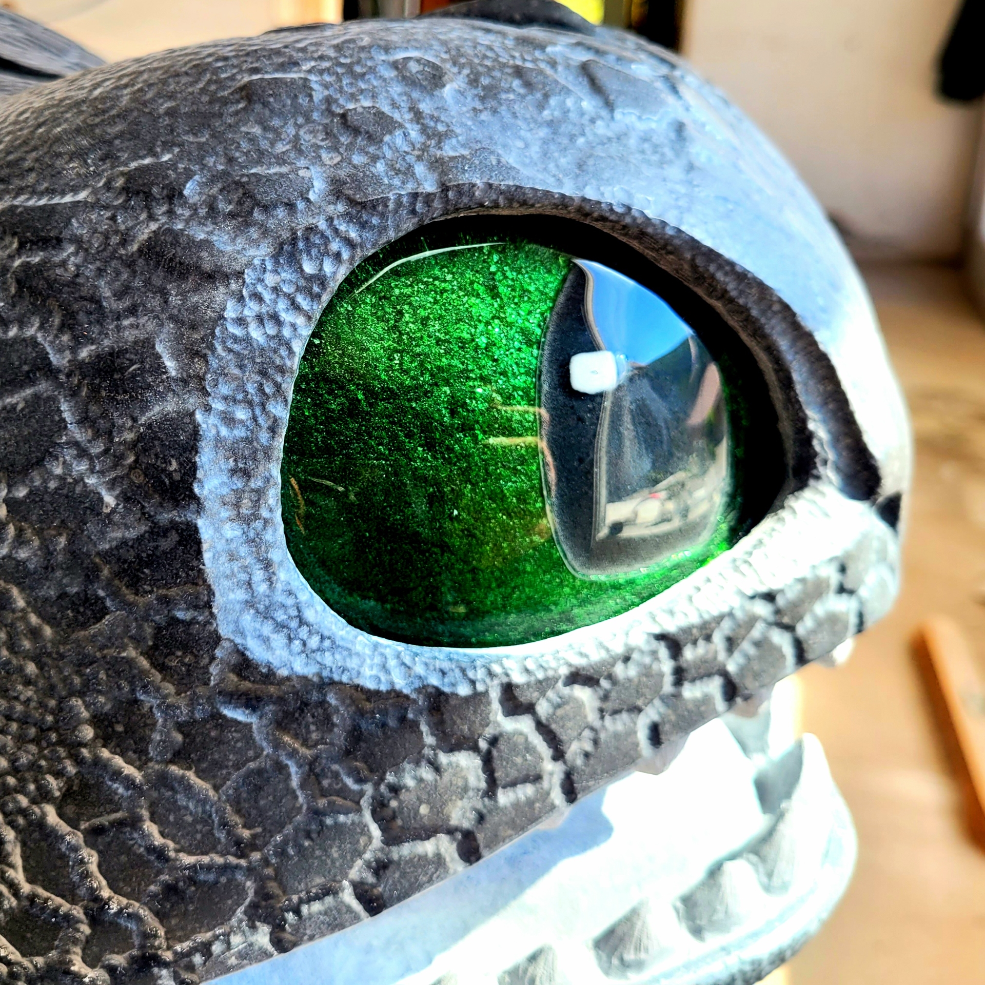 The last major step was the eyes. Until then, placeholders had served their purpose, but now the sculpture needed something more. Fortunately, I am married to the most talented art glassmaker I know. Together, we created domed eyes from several layers of specialty glass, formed using a complex fusing technique. Emerald green, slightly translucent, with depth and a quiet shine. When I finally set them in place, something changed. The dragon’s gaze became alert and present, as if he might lift his head at any moment.
