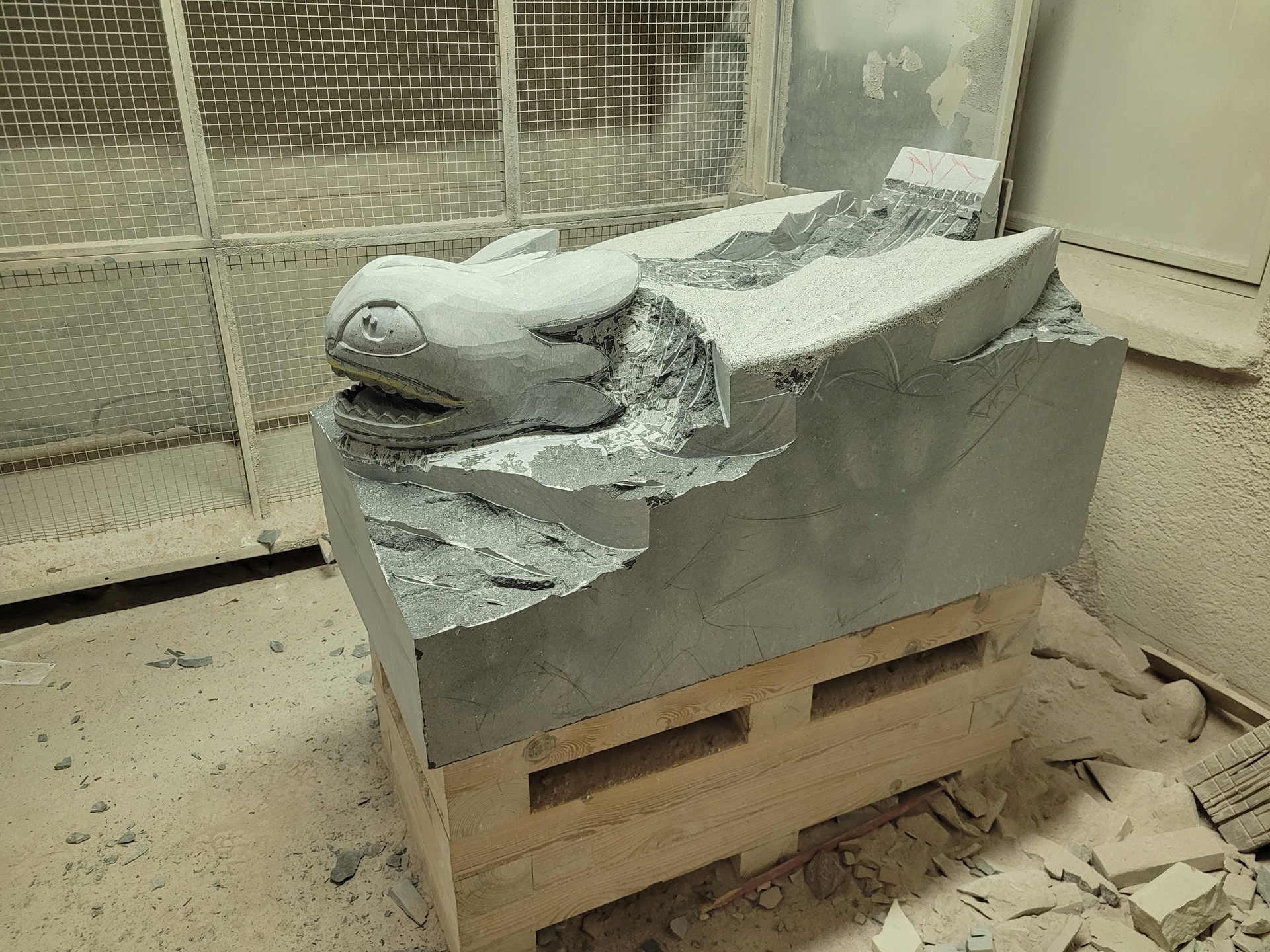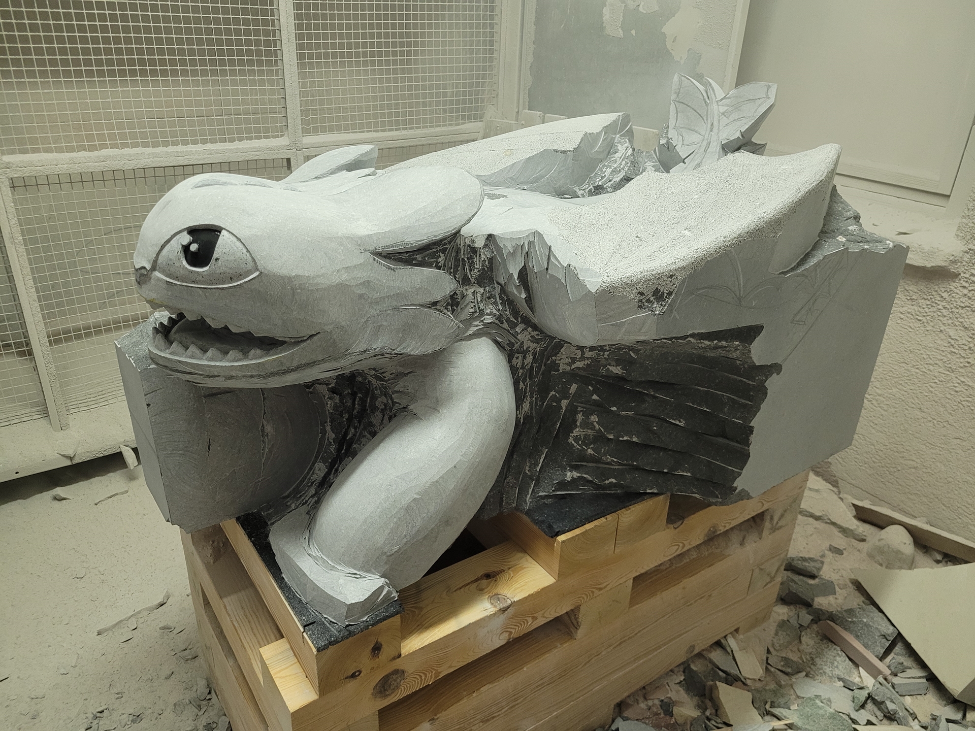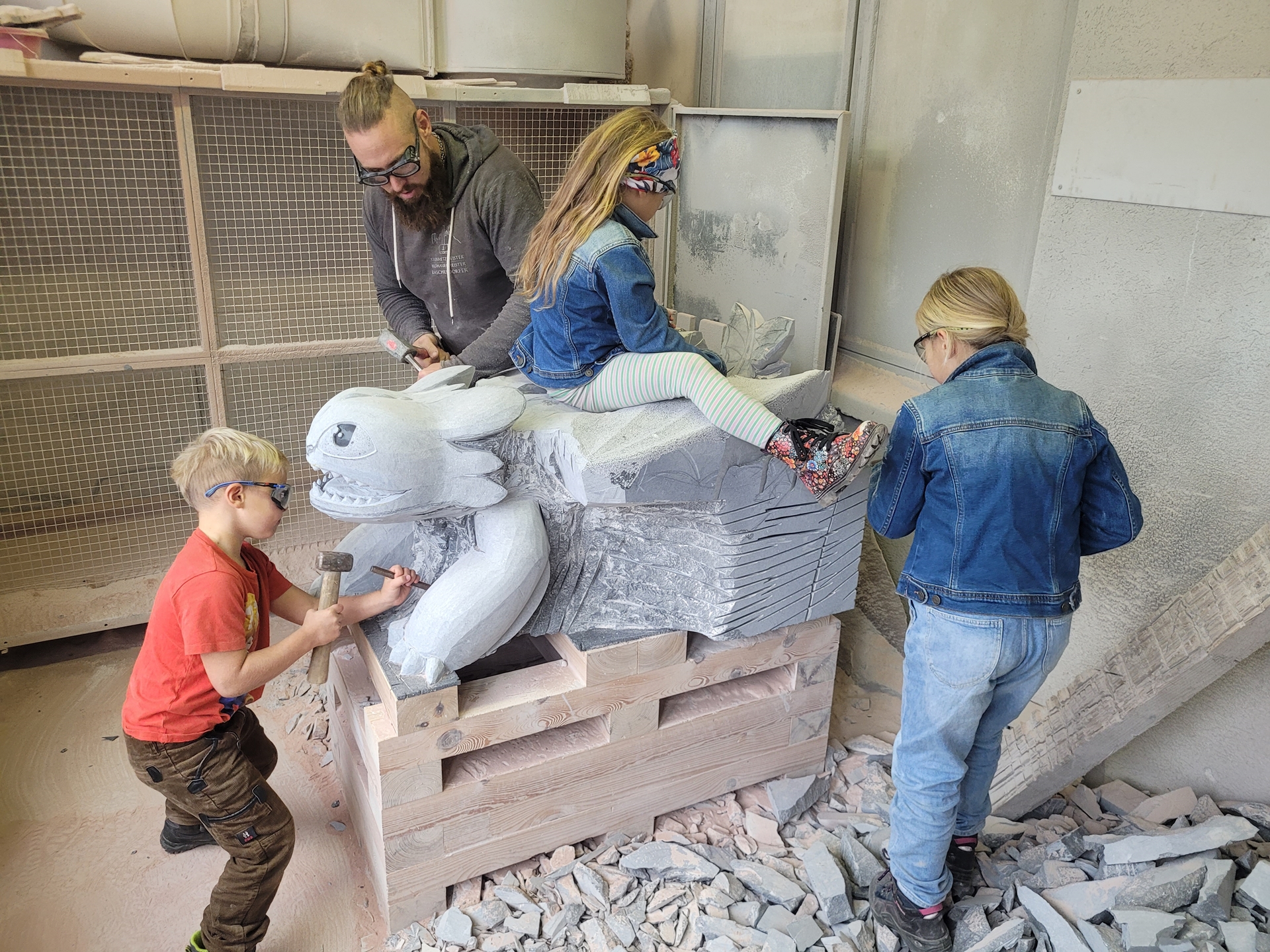The dragon took shape quickly. First the face, then the back, tail, and wings. One moment that stuck with me was when the kids joined me in the workshop with safety goggles, hammers, and chisels. I had prepared the cuts, and they got to knock out a few pieces. Just a few kilos of stone came off, but it was enough to make a memory. And that’s what matters.