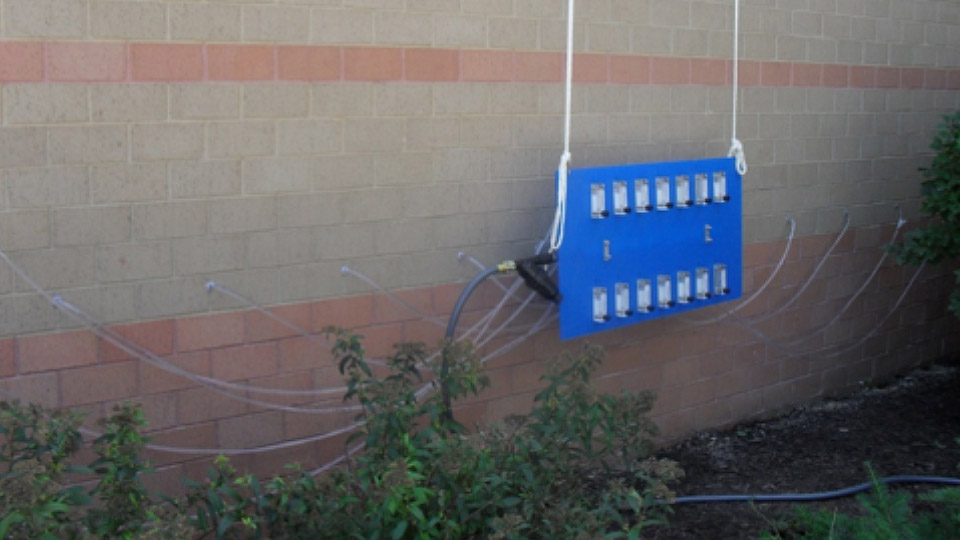 Masonry cavity drainage testing in progress.