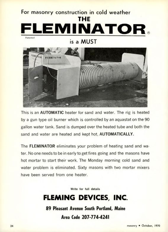 For masonry construction in cold weatherThe FLEMINATOR Patented is a MUST.This is an AUTOMATIC heater for sand and water. The rig is heated by a gun type oil burner which is controlled by an aquastat on the 90 gallon water tank. Sand