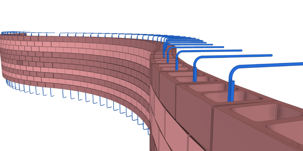 The Tekla masonry tool can place walls with various patterns, shapes, colors along with multiple layers of structural masonry, air barriers, brick veneer, etc.
