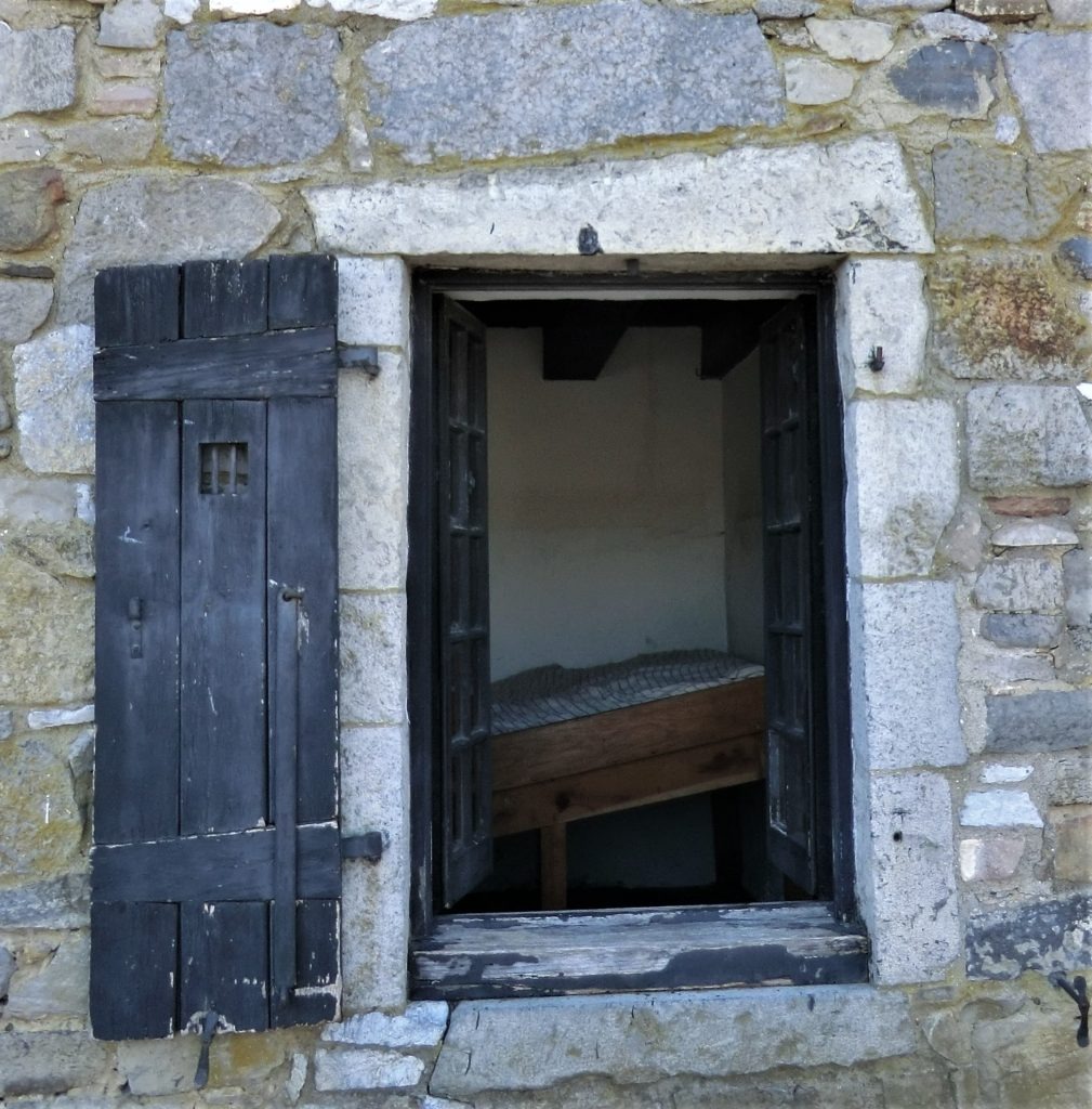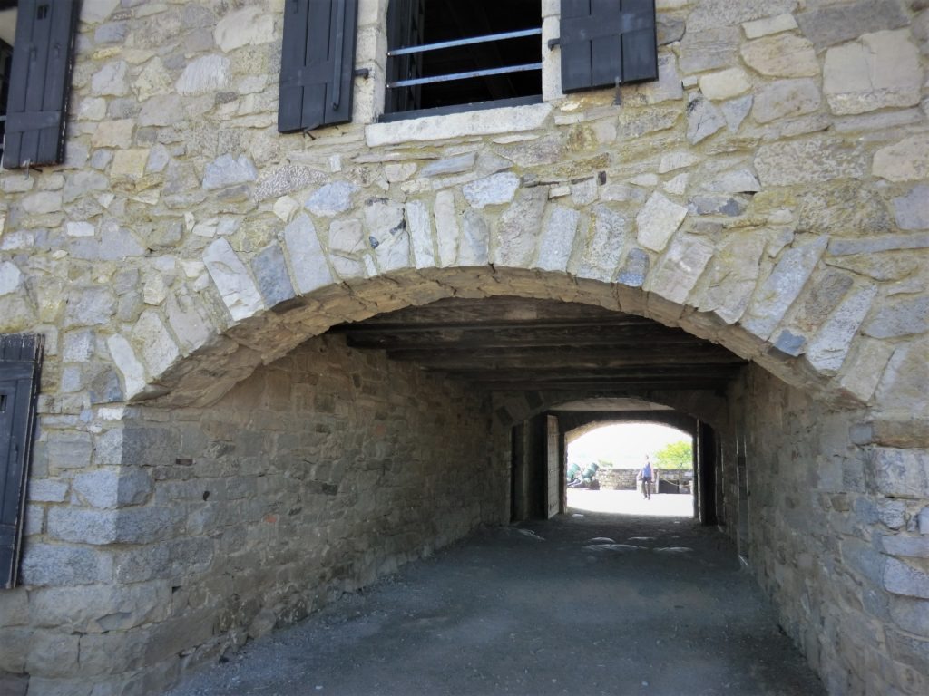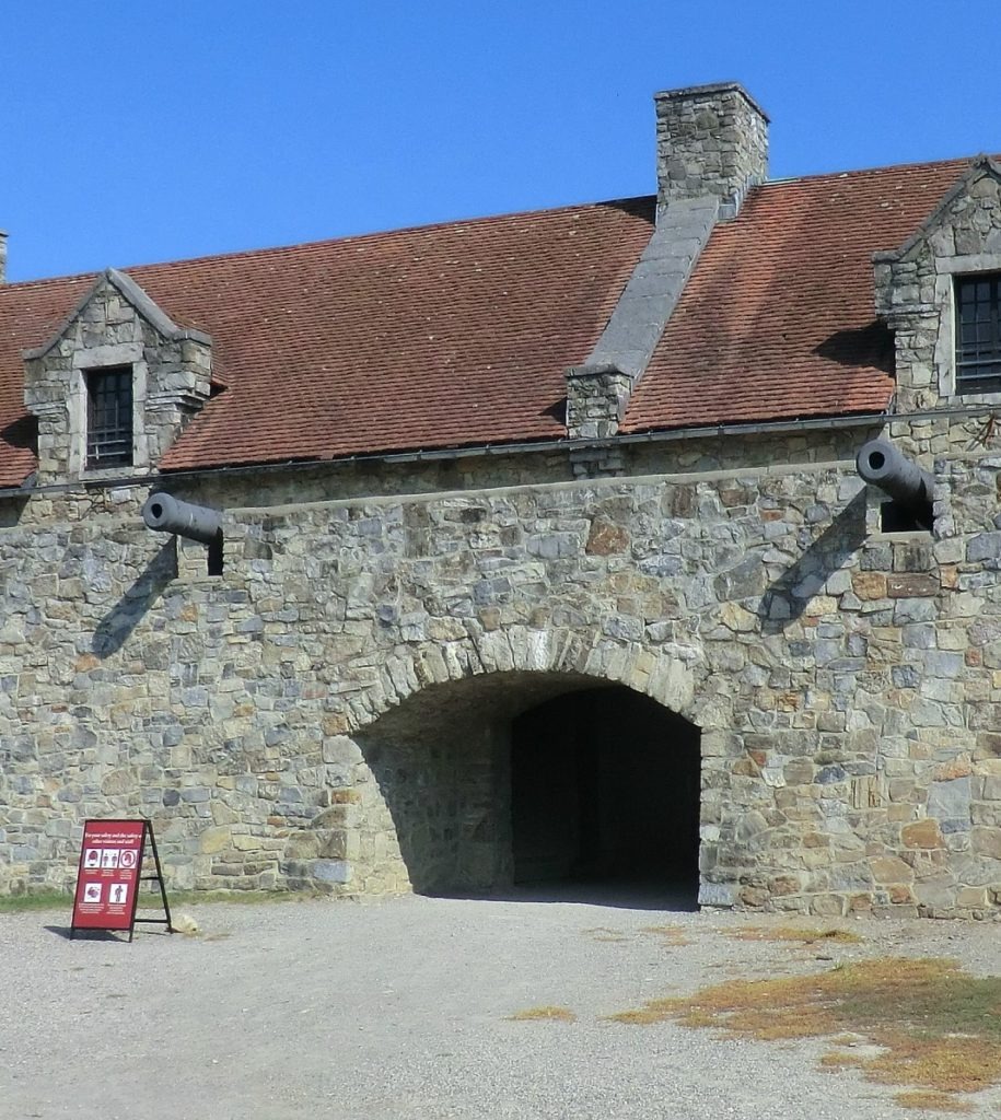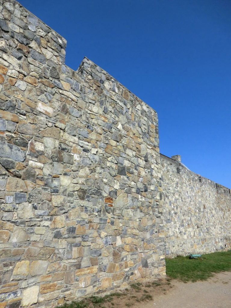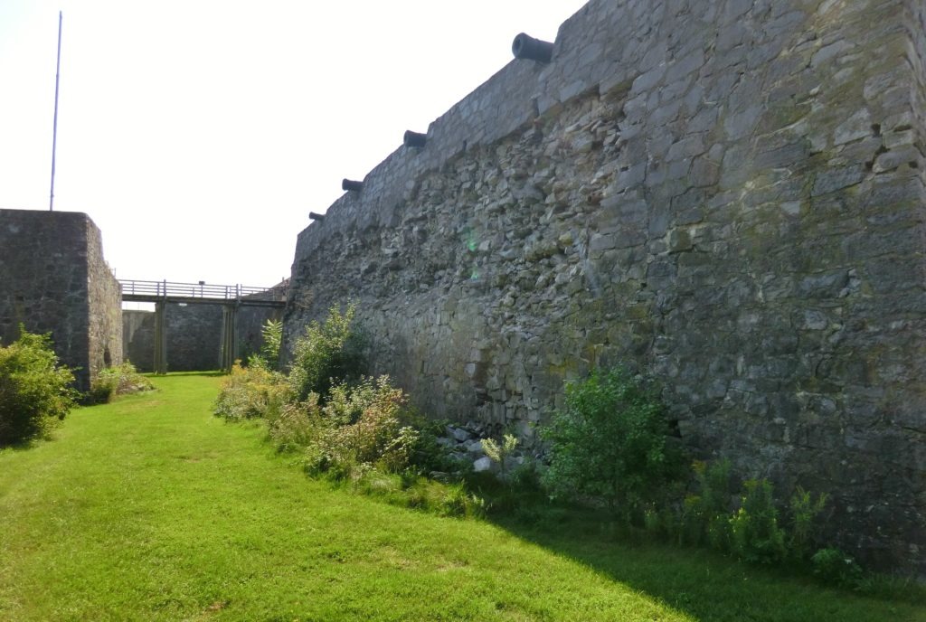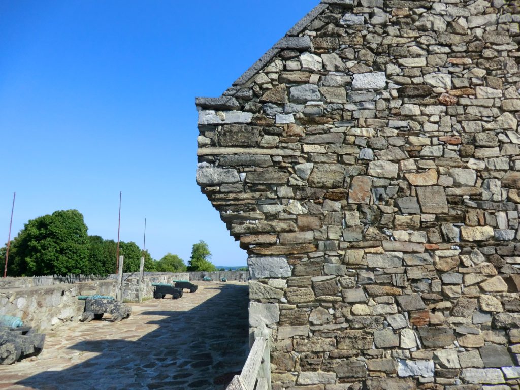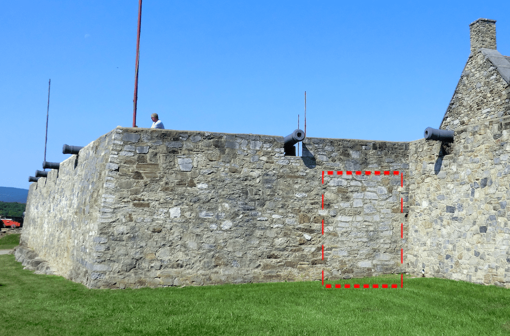 The original fort had earthen-filled bastions and curtain walls retained by logs. 20th-century reconstruction introduced stone walls (Figure 9) and steel framing to create storage spaces below. The reconstruction further extended the curtain walls higher to create platforms for the cannons (Figure 10). The “ghost” of the door in Figure 9 is still evident in the current construction.