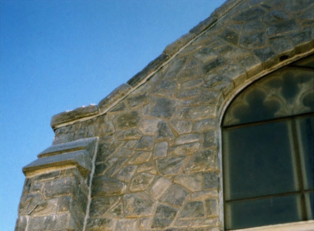 Another wonderful detail includes the anchoring of the stone coping on the tops of the gable ends. Figures 17 and 19 also show examples of using horizontal stones to restrain the sloping copings. Figure 21 provides a close-up. The slope helps shed water naturally. Another historic means for creating copings uses metal (see Figure 20); these too shed water and protect the walls below. Interestingly, many newer buildings use stone copings that are anchored or pinned to the wall below without the horizontal stones (Figure 22 from a church in Bennington, VT). These copings are prone to leaking into the top of the joints and damaging the walls.