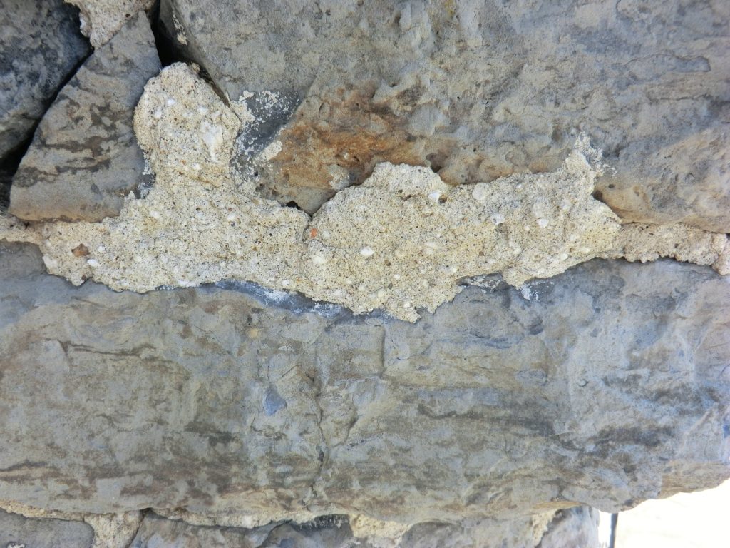 The original mortar was lime-based and had ground up shells in the mix (Figures 26 and 27). There are visible lime pockets in the original mortar. There are locations where the original mortar is intact and functioning well; in other locations, the mortar eroded and the joints were repointed.