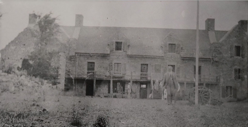 By the time the Pells decided to reconstruct the fort, the most significant portion of the fort to survive was the Officers’ Barracks (West Barracks). Figure 6 is taken looking at the West Barracks from the parade grounds before the 1909 restoration; it shows the remains of the barracks that were included in the restoration. These walls are incorporated into Figures 7 and 8.