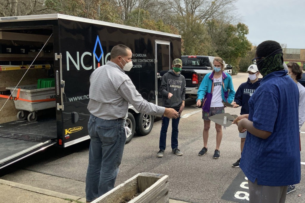 The NCMCA Mobil Training unit and Ryan Shaver make a stop at Leesville Road High School in Raleigh for “Afternoon Masonry Club.” NCMCA’s Raleigh Chapter meets regularly with students interested in masonry even though the school does not offer a masonry curriculum. Photo by Macy Williams