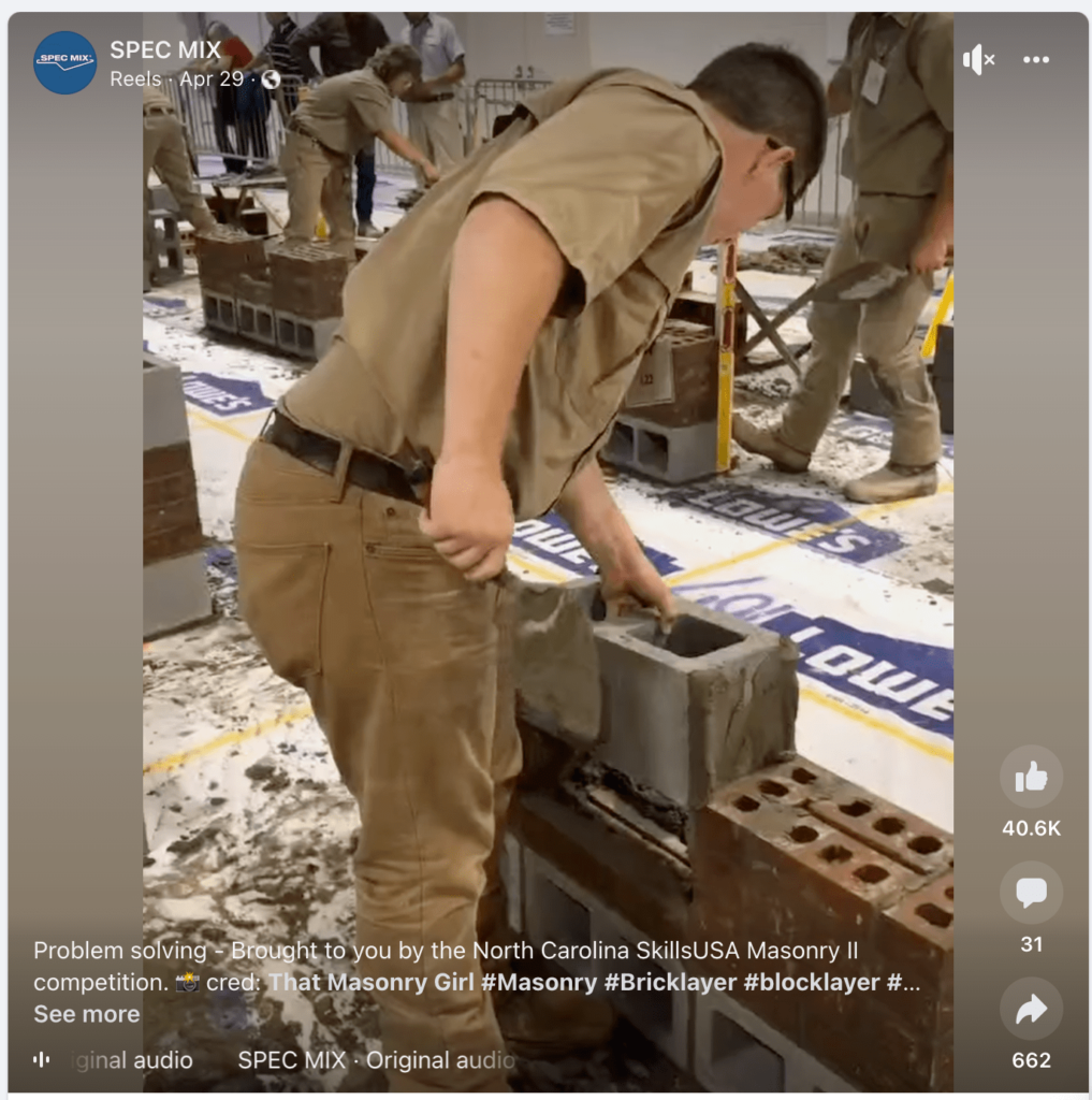 A snapshot from a regional SkillsUSA event post - receiving over 40k likes, and over 660 shares. Using the SPEC MIX brand to promote the trade has always been our mission, and our audience responds.